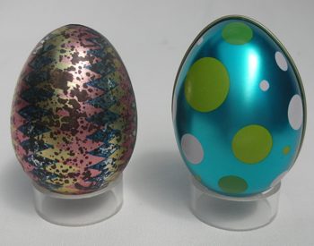 Aller Anfang ist leicht. Als ich 1984 dieses ausgefallene Sammelgebiet entdeckte, konnte ich auf Flohmärkten und Messen die in der Grösse eines Hühnereies weit verbreiteten Blechdöschen erstehen. Die Blechdosenfabrik Siegerist war ebenfalls ein ergiebiger Lieferant. Von Anfang an habe ich aber auch kleinere und grössere Blecheier in die Sammlung integriert, allerdings nicht konsequent. Trotzdem hat sich einiges angesammelt und ich habe mich deswegen entschieden, auf den Fotos immer auch das Zentimetermass abzubilden. |